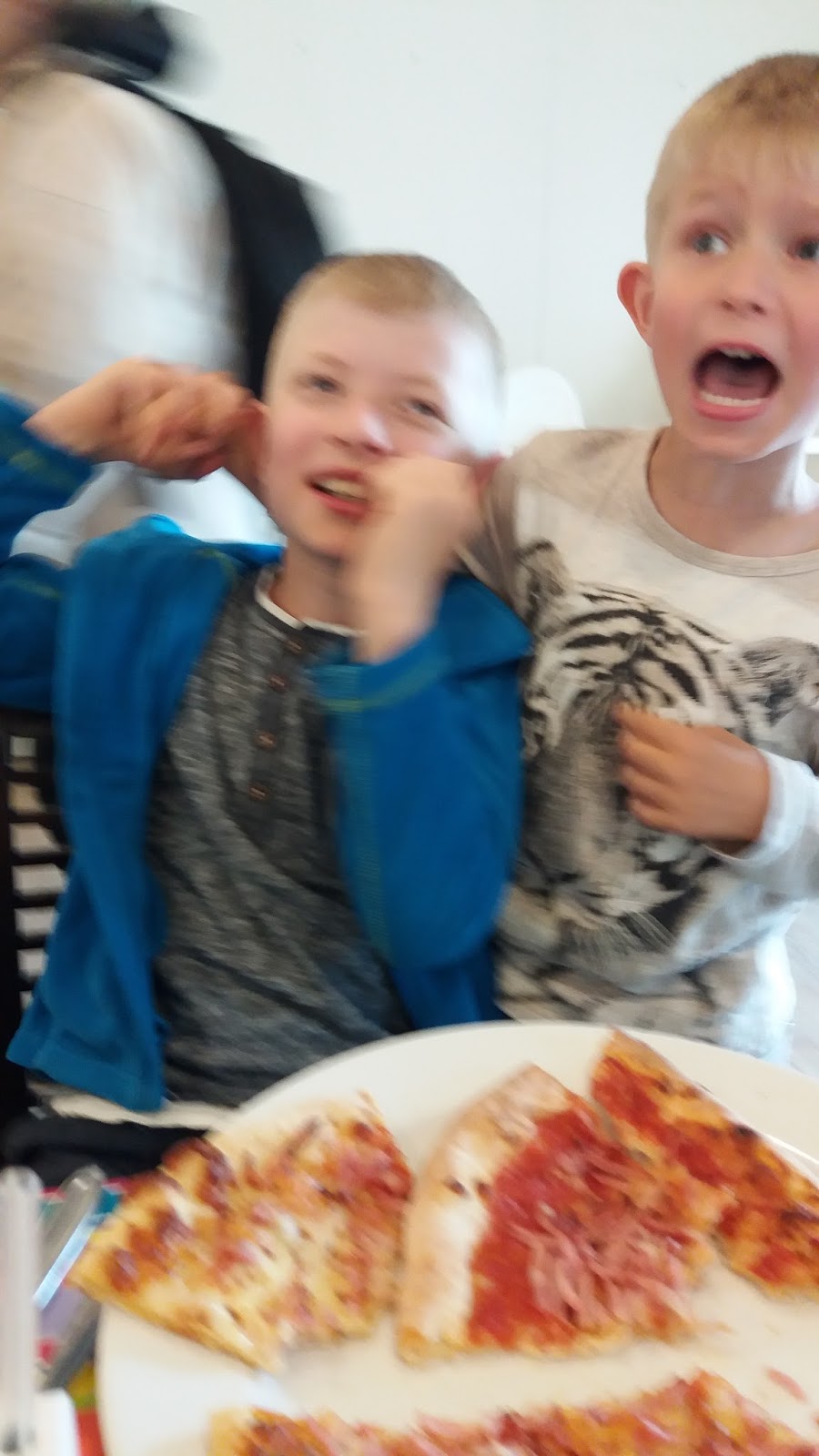 Till lunch åt de flesta av oss pizza. Jag fick hjärnsläpp och beställde var sin pizza till Gustav och Oskar, när de lätt hade kunnat dela på en. Det blev en hel del pizza över men den tog jag med mig, när vi gick, och så åt barnen den, när vi kom hem.